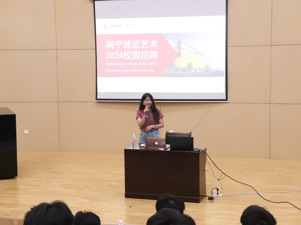 招聘会开始,南宁市诚远艺术培训学校人事副校长黄书华老师向大家详细介绍了南宁市诚远艺术培训学校的发展历程、学校概况和艺术成就,让同学们对诚远有了初步的了解。随后,黄老师着重介绍了对应届毕业生和实习生的应聘要求和薪资概况,以优质的资源吸引现场的同学们的加入,邀请了曾毕业于betway必威西汉姆联官网,现任职于南宁市诚远艺术培训学校的学长们现场为同学们答疑解惑。本次招聘会提供声乐教师岗位5个、钢琴教师岗位3个、视唱练耳教师岗位3个、舞蹈教师岗位2个、美术教师岗位5个、实习教师岗位10个。最后,有意向应聘的同学在现场提交简历,参与了面试环节。