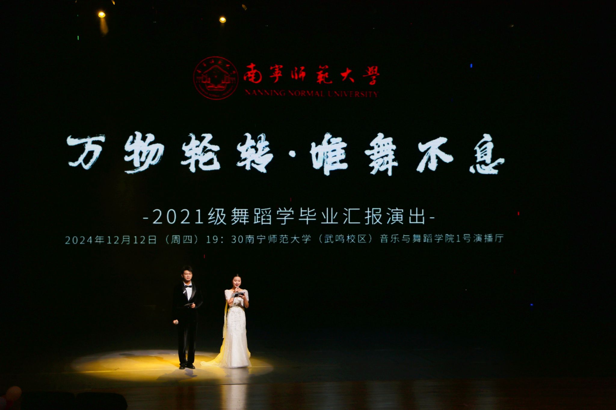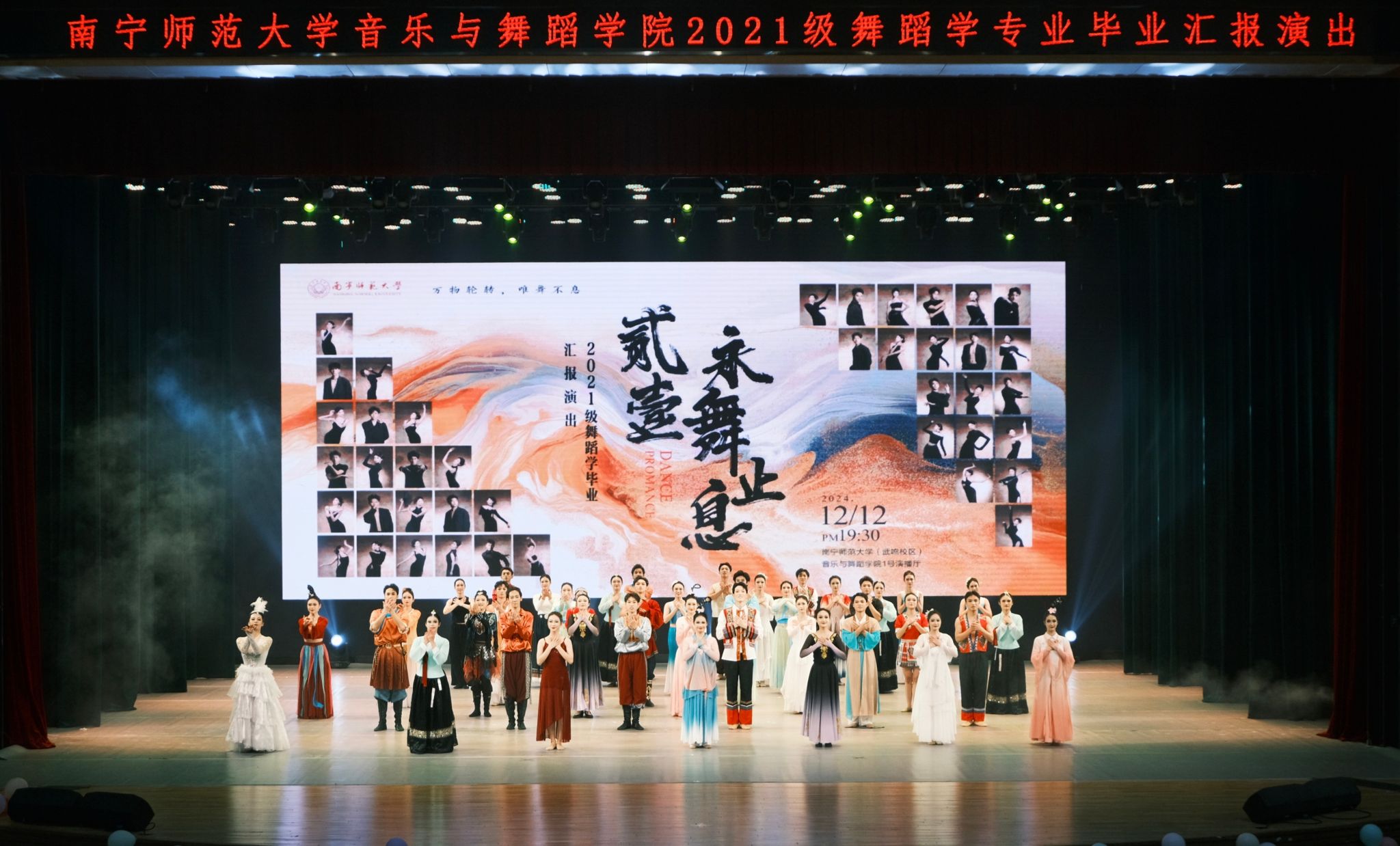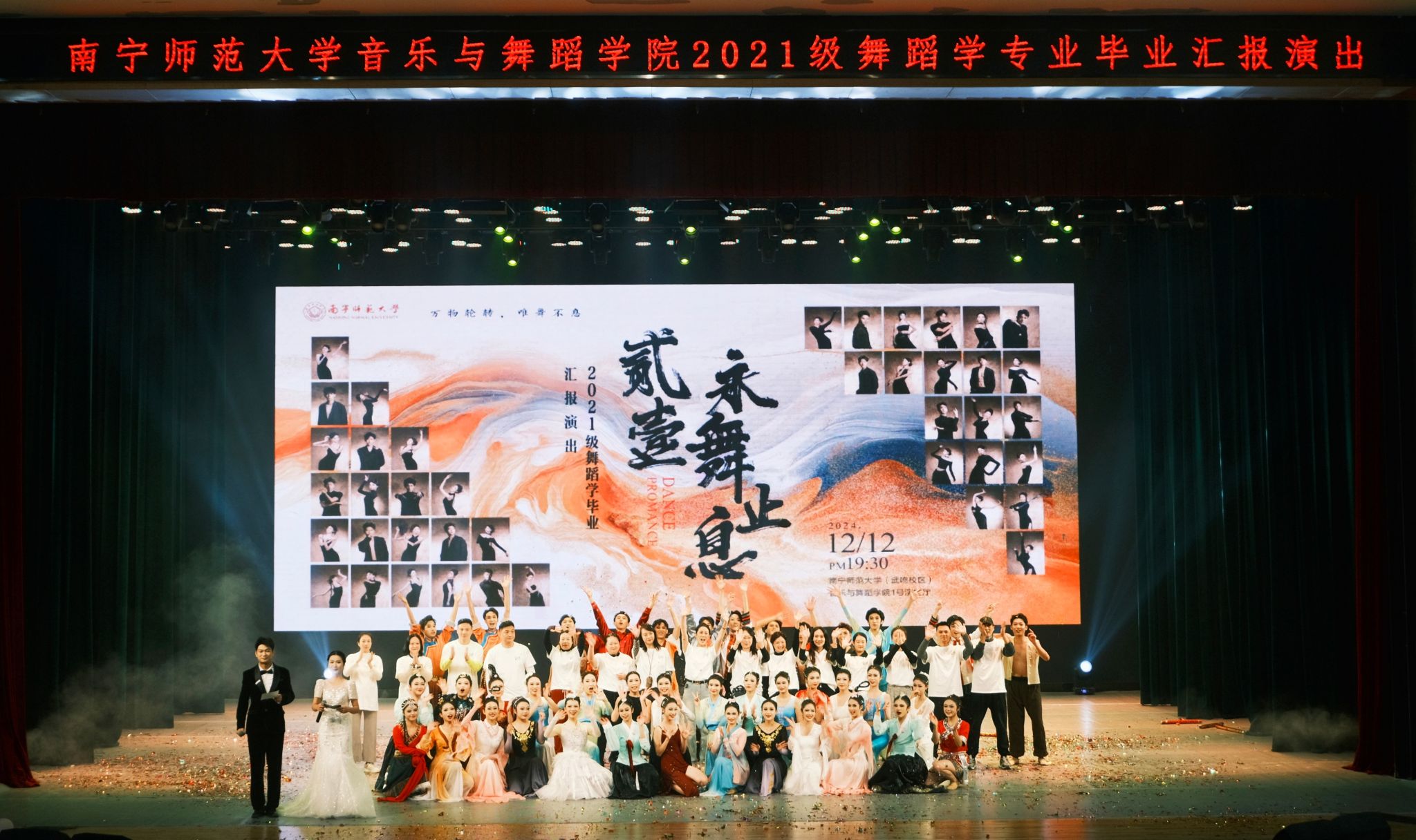 2024年12月12日晚19:30,音乐与舞蹈学院在武鸣校区—号演播厅成功举办2021级舞蹈学毕业晚会《永舞止息》。众多校内外领导、老师和同学们共同观看了这场演出,现场掌声雷动,气氛热烈。