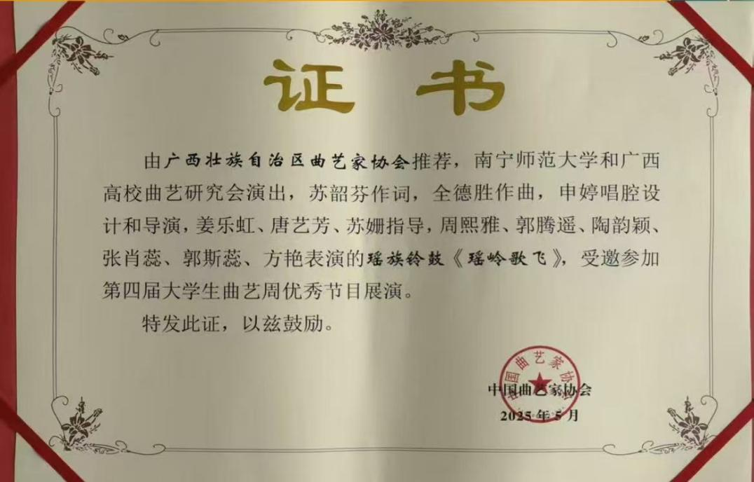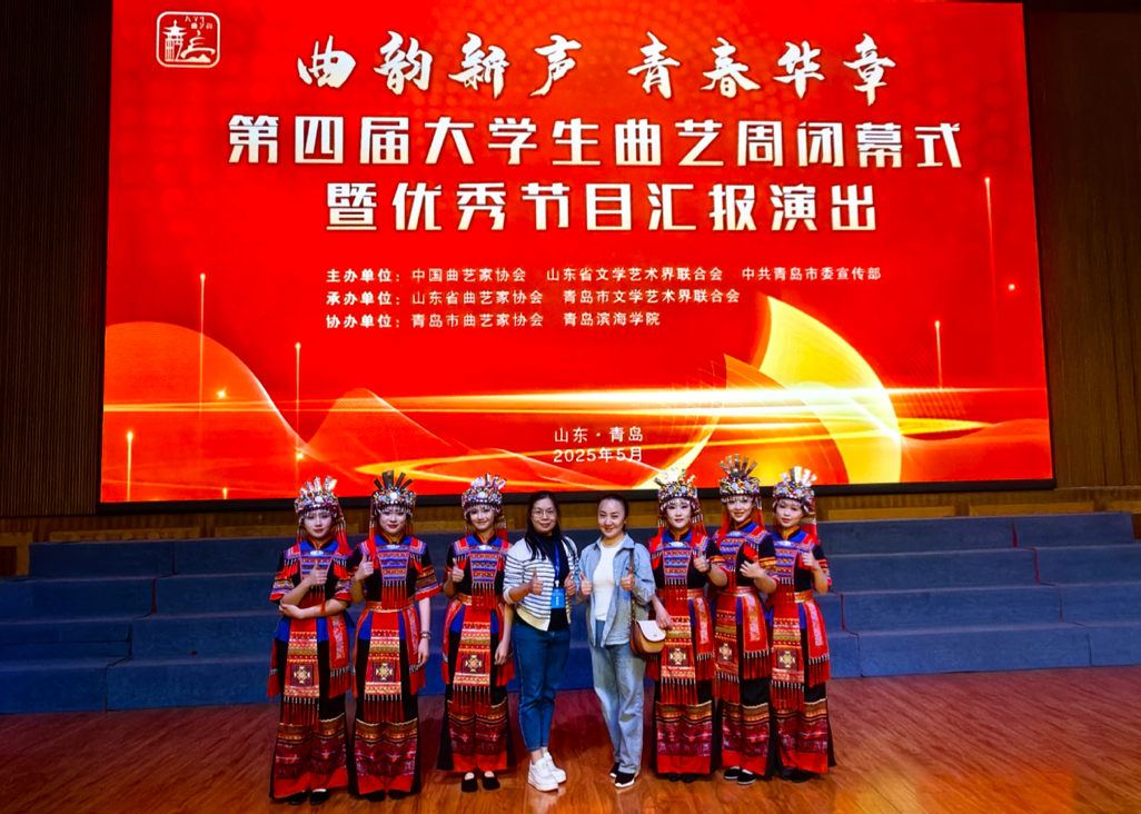 5月9日-11日,由中国曲艺家协会、山东省文联、青岛市委宣传部主办,山东省曲协、青岛市文联承办、青岛市曲协协办的第四届大学生曲艺周在山东青岛举办。我校师生携原创民族曲艺作品瑶族铃鼓《瑶岭歌飞》精彩亮相,以“非遗技艺 + 时代叙事”诠释美育与文化传承融合,绘就民族文化新篇。