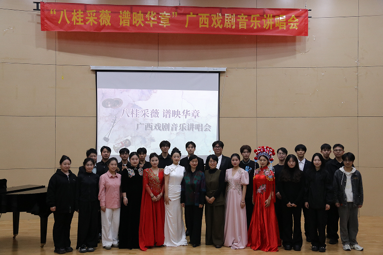 2025年11月26日晚, “八桂采薇 谱映华章”广西戏剧音乐讲唱会在武鸣校区音舞楼音乐厅成功举行。本次讲唱会由音乐与舞蹈学院举办,特邀云南师范大学艺术学院杨琛教授、广西壮族自治区民族文化艺术研究院黄羽研究馆员担任学术顾问。