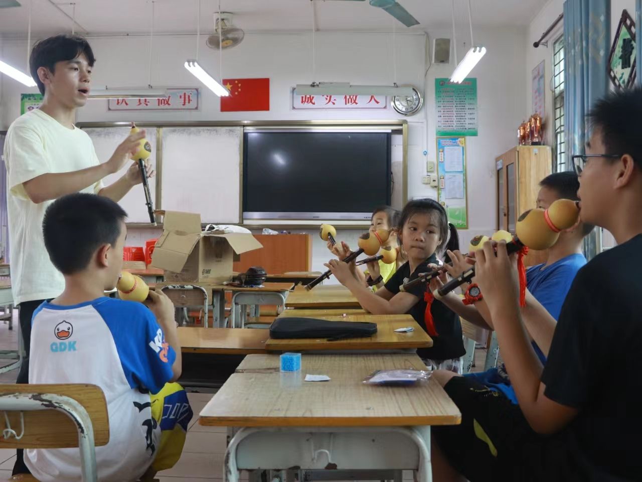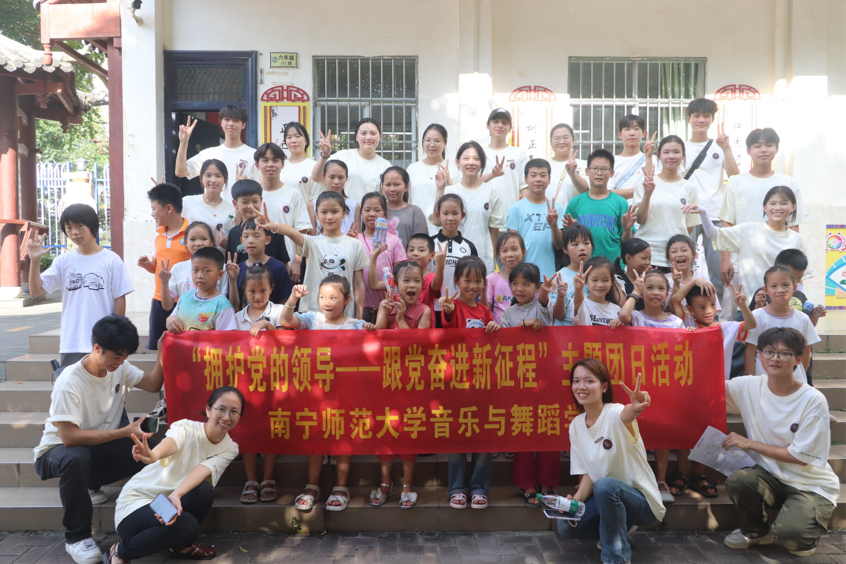 7月6日,在武鸣区城厢镇第一小学,我院师生一行19人面向城厢镇和平解放社区小朋友们成功开展了为期7天的“拥护党的领导——跟党奋进新征程”主题团日活动。本次活动以民族音乐教育为载体,旨在激发我院学子的爱国热情和民族责任感,弘扬志愿服务精神。